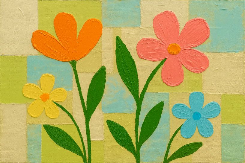 The cheerful flowers in orange, pink, yellow and blue form a lively contrast to the background of soft pastels.…