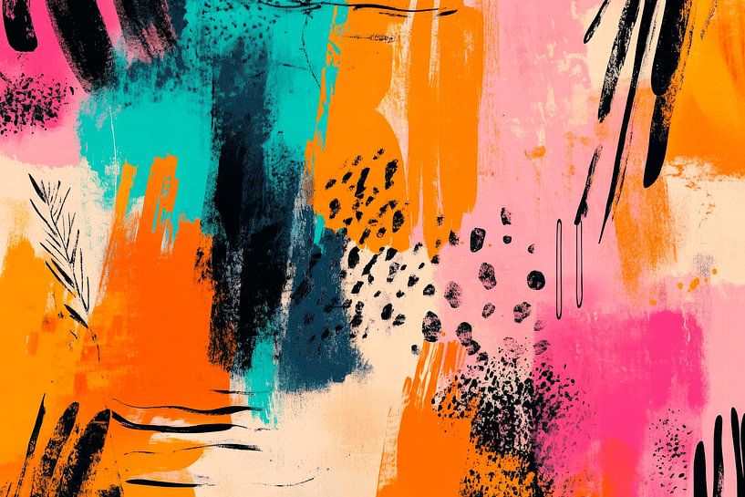 Vibrant drops of orange, pink and turquoise dance across a soft, cream-coloured base. The dynamic brushstrokes and playful patterns add energy and vitality to any room. Ideal for the living room to enliven relaxed conversations or to fill the kitchen with creative freshness - a real feast for the senses!