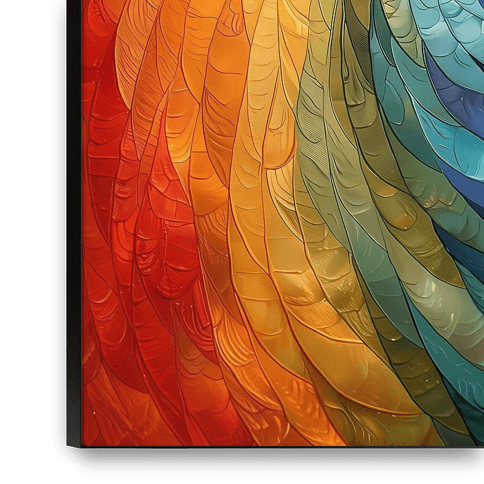 This colourful abstract artwork combines a vibrant mix of colours and shapes that will instantly revitalise your interior. With shades of orange, yellow, blue, green and red, this design creates a dynamic and energetic atmosphere. Perfect for the bedroom or office, where it serves as an inspiring and refreshing focal point. The patterns…