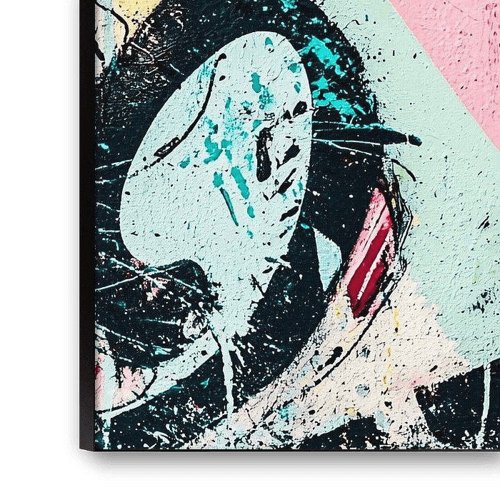 This striking artwork combines dynamic shapes and splashing colours in a contemporary street art style. The mix of pink, turquoise, yellow and black creates a vibrant and energetic look, perfect for bringing a space to life. Whether hung in a bedroom, hallway or office, this design adds a unique artistic flair to any environment. The abstract patterns and textures make it a fascinating and versatile decorative piece that continues to intrigue and inspire. A must-have for lovers of modern art with a playful character.