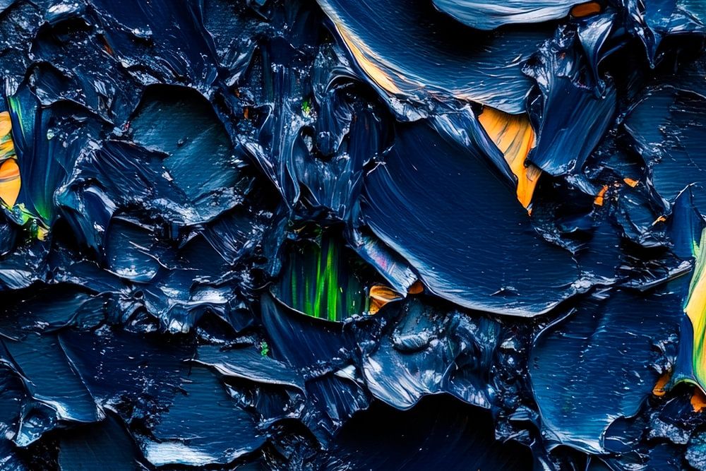 A fascinating texture of deep dark blue, interspersed with vibrant, luminous accents, unfolds a play of light and shadow. The dynamic surface structure conveys a certain depth and power that fits perfectly in a modern living room to create an artistic accent and attract attention.