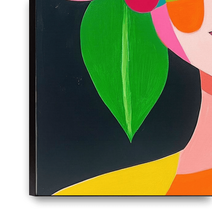 The painting shows an expressive portrait of a woman whose face is divided in vivid colours and geometric shapes. The large, almond-shaped eyes, the blooming presence of the head and the bright, stylised colours are striking, creating a harmonious combination of nature and humanity. The depiction conveys a message of diversity and…