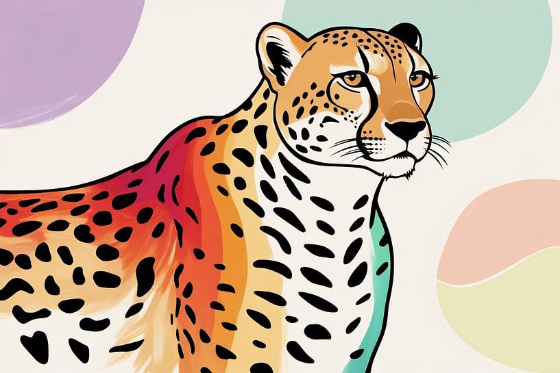 This vibrant artwork depicts a beautiful cheetah in a contemporary, colourful style. The bright colours and abstract background give it a modern and eye-catching character, perfect for those looking for something that lifts the space. With its playful colour patterns and simple lines, this piece captures both the elegance of nature and a sense of contemporary art. Ideal for offices, bedrooms or other spaces that could use a touch of creativity, it brings not only colour but also a dynamic sense of movement and power to the space. The cheetah exudes self-assurance and energy, making it a perfect eye-catcher.