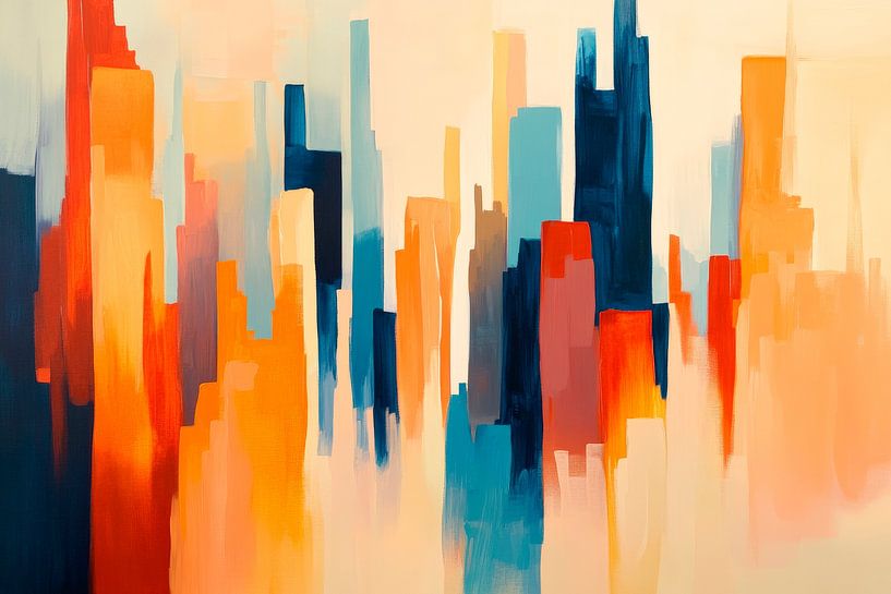 Buy this abstract artwork Colourful city silhouette in the evening light by Poster Art Shop on canvas, ArtFrame, poster and wallpaper, printed on demand in high quality.