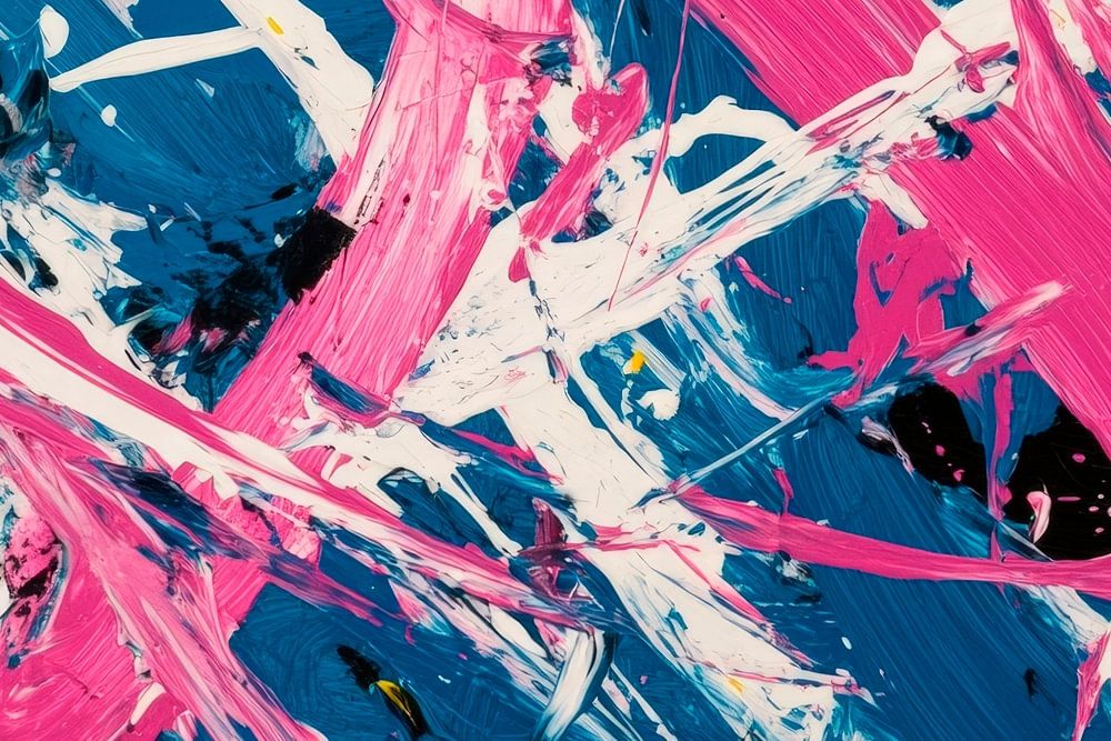 With energetic brushstrokes, a vibrant play of colours unfolds from radiant pink, calming blue and bright yellow on a deep black background. The dynamic lines and contrasting colours add a lively touch to any room. Ideal for a creative living room that invites inspiring dialogue and stimulates lively conversations.