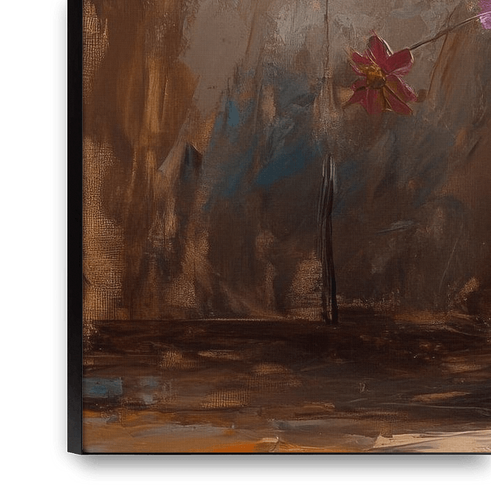 A vibrant mosaic of colours unfolds in the vase, where bright sunflowers and delicate blossoms shine in harmonious interplay. The rustic surroundings complement this floral splendour, while warm light emphasises the textures of the petals and leaves. A heartfelt expression of nature, captured in a perfect moment of stillness.