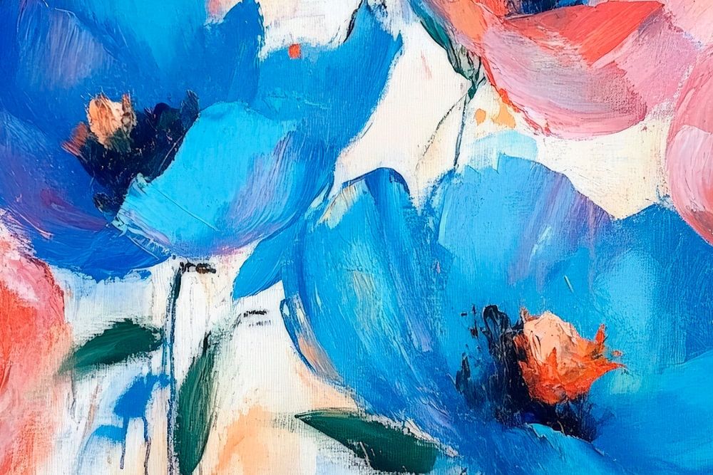 A cheerful floral arrangement unfolds its blaze of colour, with bright blue and soft red tones contrasting harmoniously with each other. The vibrant brushstrokes create a fresh and inviting atmosphere, perfect for the living room, where they can spread joie de vivre and creativity. A real eye-catcher for any room!