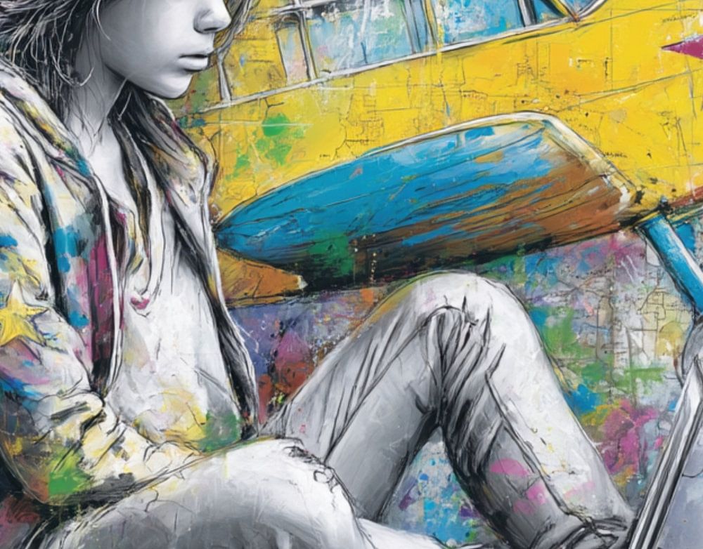 Graffiti painting of a girl sitting on the ground with a laptop on her lap, wearing a colourful hoodie with stars and aviator glasses. Behind them is a bright yellow plane with a red star. The background consists of a vibrant mix of colours, an abstract map of the world.