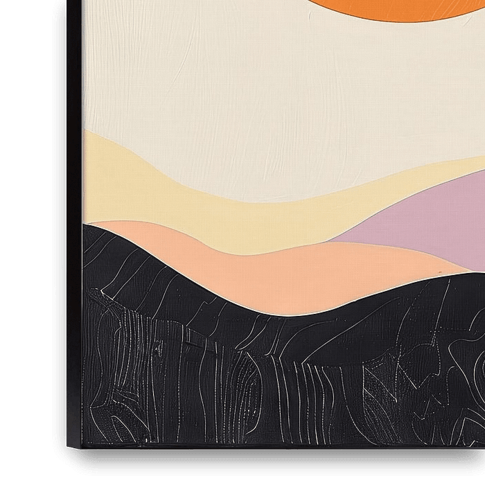 This impressive painting combines bold colours and clear shapes to create a harmonious overall picture. Two large circles in bright orange and yellow dominate the composition and symbolise sunshine and energy. The curved lines in black, pink and blue add a dynamic touch and make the landscape appear almost surreal. Inspired by modern…
