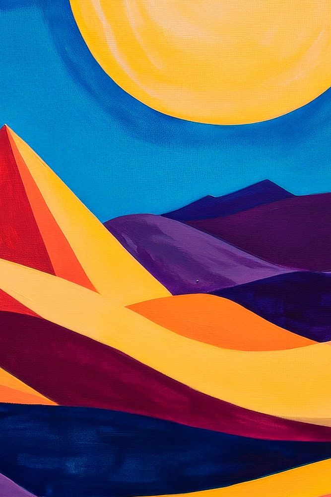 A dreamy landscape unfolds in soft purple and yellow tones, in which gentle hills and a glowing sun dance harmoniously together. The geometric shapes lend the scenery a modern touch that provides creative inspiration in a living room or motivating thoughts in an office.