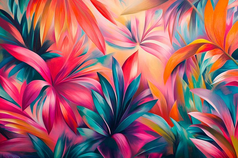 Vibrant colours blend harmoniously and transport you to a tropical oasis. The lush leaves pulsate in bright pink, blue and green, creating a cheerful atmosphere. Perfect for the living room, this work of art brings a touch of exoticism and freshness that enlivens any room and invites you to linger.
