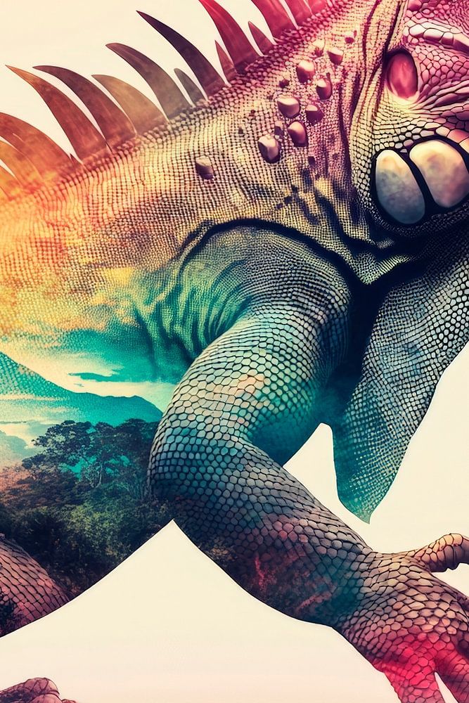 A fascinating dream of colour unfolds in this artistic work, where a majestic lizard merges with vibrant, tropical landscapes. The gentle transitions and vibrant tones give the room an exotic flavour. Ideal for a living room that wants to exude a touch of adventure and creativity.