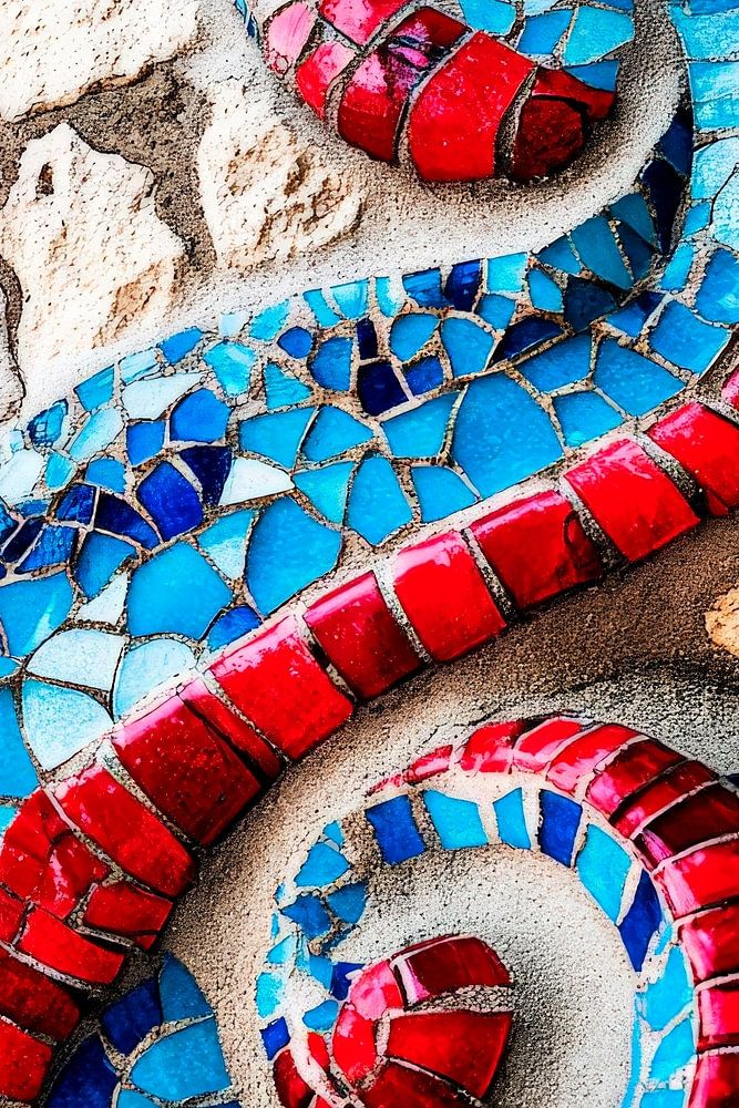 An artistic swirl of vibrant red and cool blue that transforms the walls into a shimmering work of art. The curved shape and the contrast with the rustic stones give the room a dynamic energy. Ideal for kitchens or living rooms where creativity and socialising are encouraged.