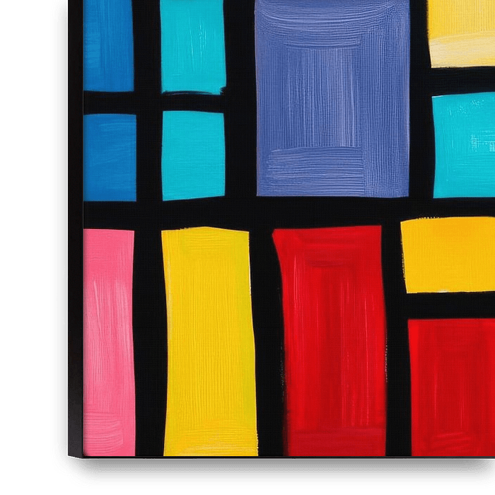 A lively interplay of colourful rectangles unfolds in a harmonious chaos. The bright colours-blue, red, yellow and pink-contrast strongly with the deep black in the background. The geometric shapes lend the picture a dynamic structure that captivates the eye and invites exploration. A play of simplicity and diversity in perfect symbiosis.