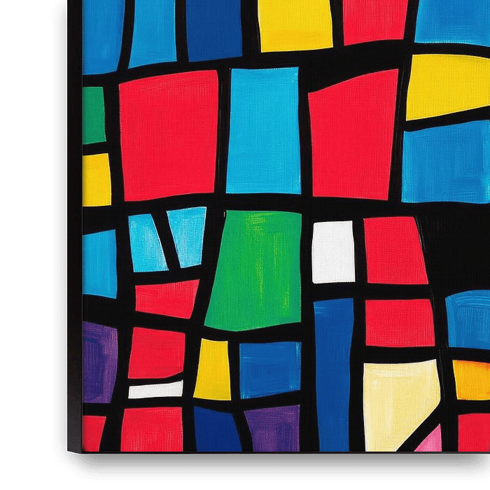 A lively mosaic of bright colours and geometric shapes captivates the viewer. The active contrasts between red, blue, yellow and green create an energetic dynamic, while the black-framed design is reminiscent of a modern urban silhouette. Here, colours and shapes dance in a harmonious, chaotic interplay.