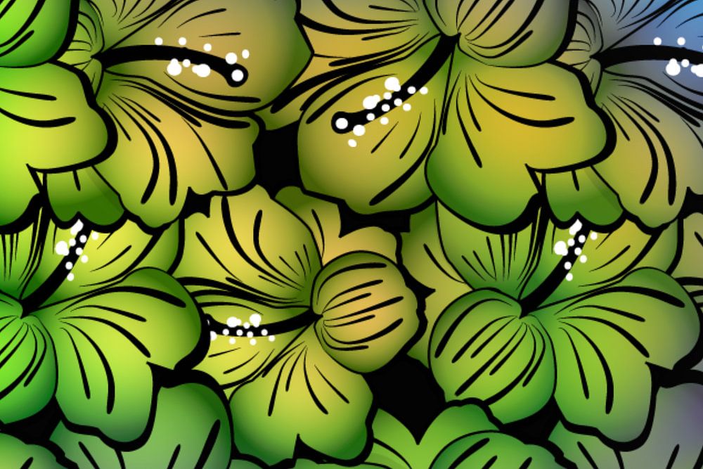 Colourful pattern of hibiscus flowers. Graphic pattern. Digital art. Green, blue and a hint of orange. Abstraction. Decorative art. Colourful and cheerful.