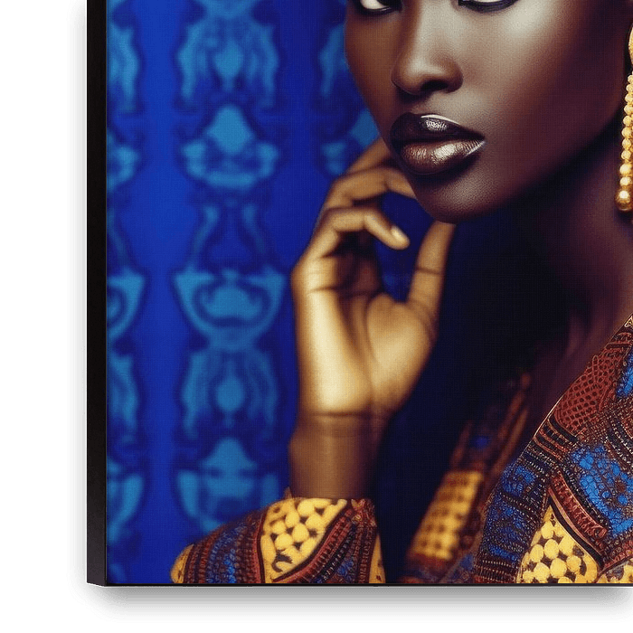 Colourful and unusual portrait of an African woman in equally colourful clothing with an African motif/pattern against a contrasting background. This makes the work pop off your wall!