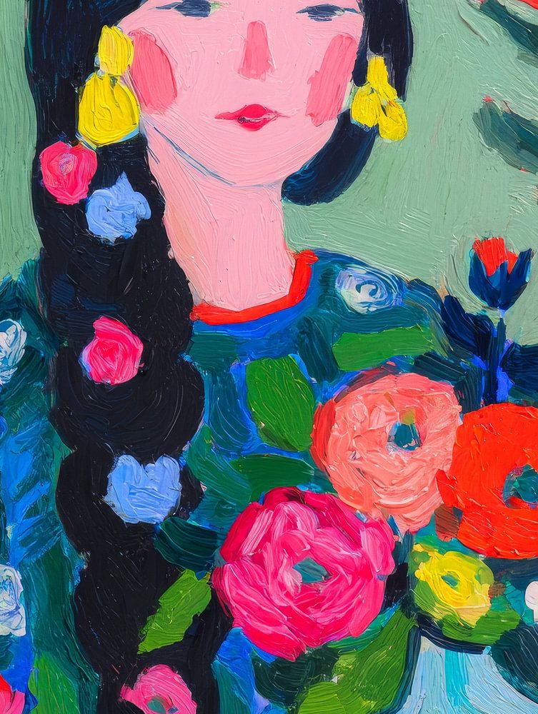This artwork exudes cheerfulness and charm through its rich colours and playful brushstrokes. It shows a young woman with a long, dark braid incorporating small flowers. She is wearing a bright blue dress with floral patterns, almost blending into the bouquet she is holding. The flowers in the vase are painted in warm shades of red, pink and yellow, which contrast beautifully with the cooler blues and greens of her clothing. Her yellow earrings and pink blush add extra vibrancy to the scene. The background with soft pinks and greens frames her like a graceful tableau, giving the painting an intimate and decorative feel. The coarse brushstrokes and bright colours emphasise the modern, expressive style and make this portrait a striking eye-catcher. This artwork celebrates femininity, colour and the beauty of flowers in a playful and contemporary way.
