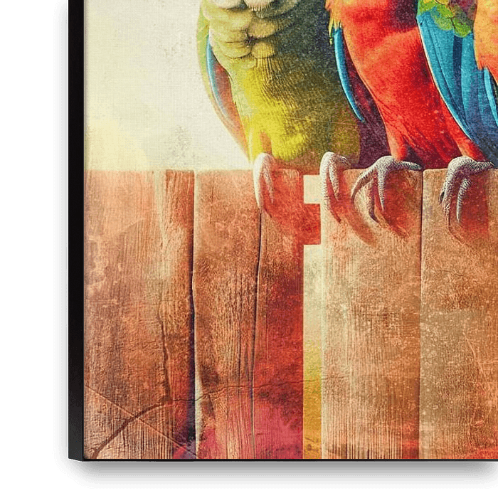 Eight colourful parrots sitting on a wooden fence. The background shows a textured sky with clouds at sunset with warm colour tones. Each parrot has brightly coloured plumage with a mixture of red, yellow, blue and green. They are positioned close together and looking forward. This image is interesting because of the vibrant colours…