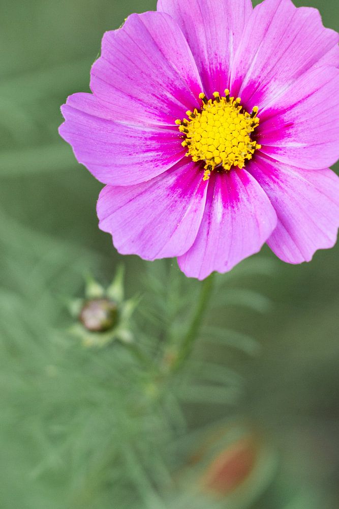 This beautiful wild flower is bright pink/purple colored and contrasts against the soft green background. The flower has super sharp details and the background is nicely blurred.
