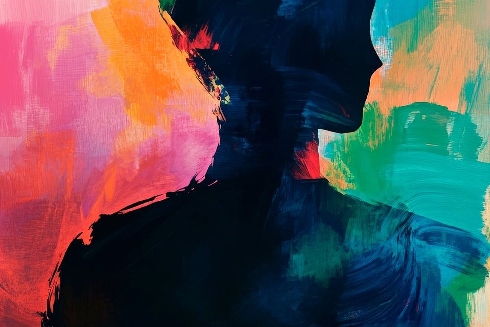 A play of colours envelops the stylised silhouette, which contrasts with the dynamic background landscape. Vibrant shades of blue, orange and green create an atmosphere of creativity and inspiration. Perfect for an office or living room to add an energetic accent and fire the imagination.