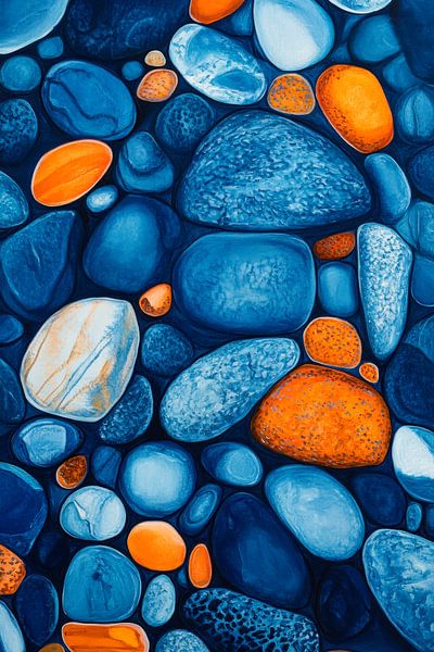 In mesmerising shades of blue and bright oranges, this work of art captures the tranquillity of a seashore. The harmonious arrangement of the stones conveys a sense of balance and serenity. Ideal for the living room or office, it creates a relaxing atmosphere and invites you to daydream.