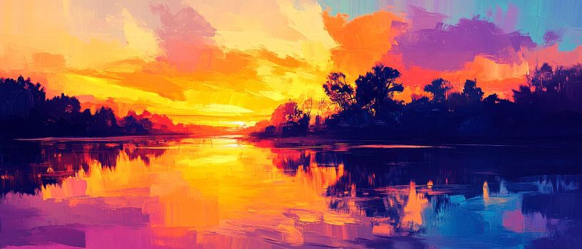 The sunset shines in soft pastel shades over a still body of water, capturing the colours in mesmerising reflections. The delicate clouds and the majestic silhouettes of the trees create a dreamlike atmosphere. This work of art brings peace and harmony, ideal for the bedroom or a relaxed living room.