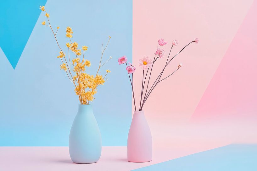 Delicate colours blend harmoniously in the background, while elegant vases with fresh, playful flowers delight the eye. Yellow and pink bring vibrant accents to the room. Ideal for the bedroom, this artwork creates a calm, welcoming atmosphere that invites you to dream and relax. Perfect for conveying a feeling of lightness and freshness.