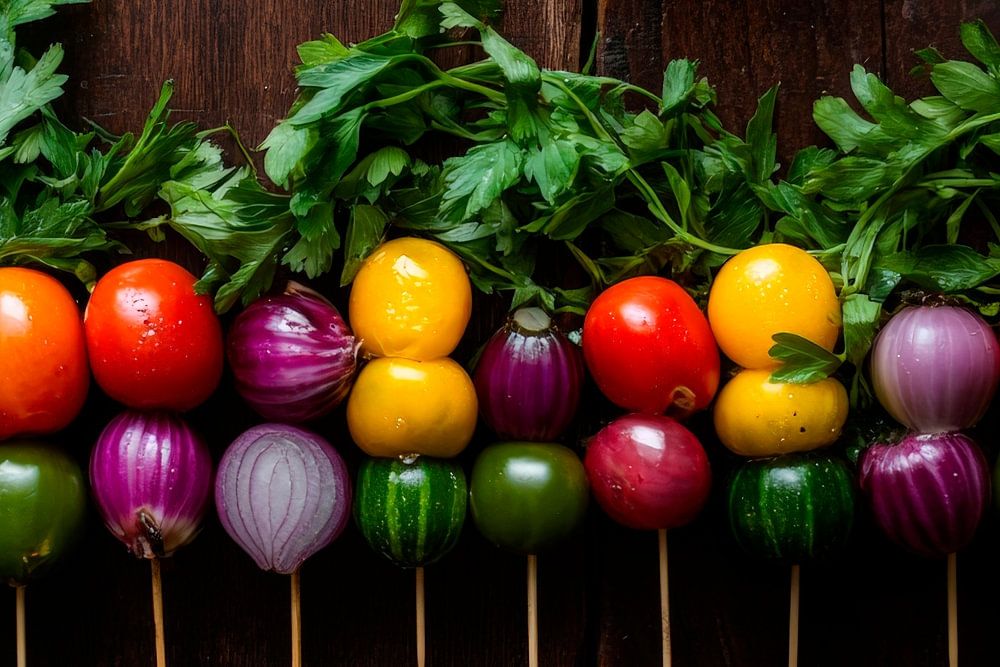 Brightly coloured vegetable skewers present themselves harmoniously on the rustic wooden table. The fresh, crunchy ingredients radiate joie de vivre and freshness. This vibrant work of art conjures up an irresistible appetite and is perfect for the kitchen or dining area to introduce guests to the flavours of the good life.