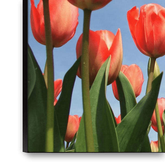 Red tulips dance in the clear blue sky, like happy notes to a summer melody.