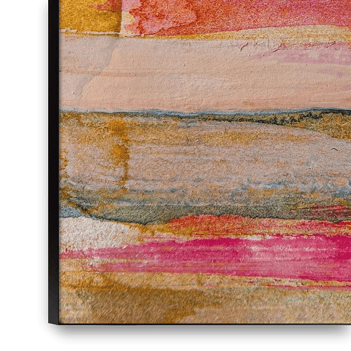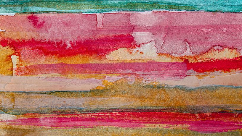 This modern, abstract watercolour painting exudes a warm, summery atmosphere through the use of soft pastel colours and vibrant accents with a Mediterranean character. The colour palette consists of light pastel pink, ochre yellow, bright magenta with a subtle neon effect, fresh turquoise, warm light brown and sparkling gold that gives…