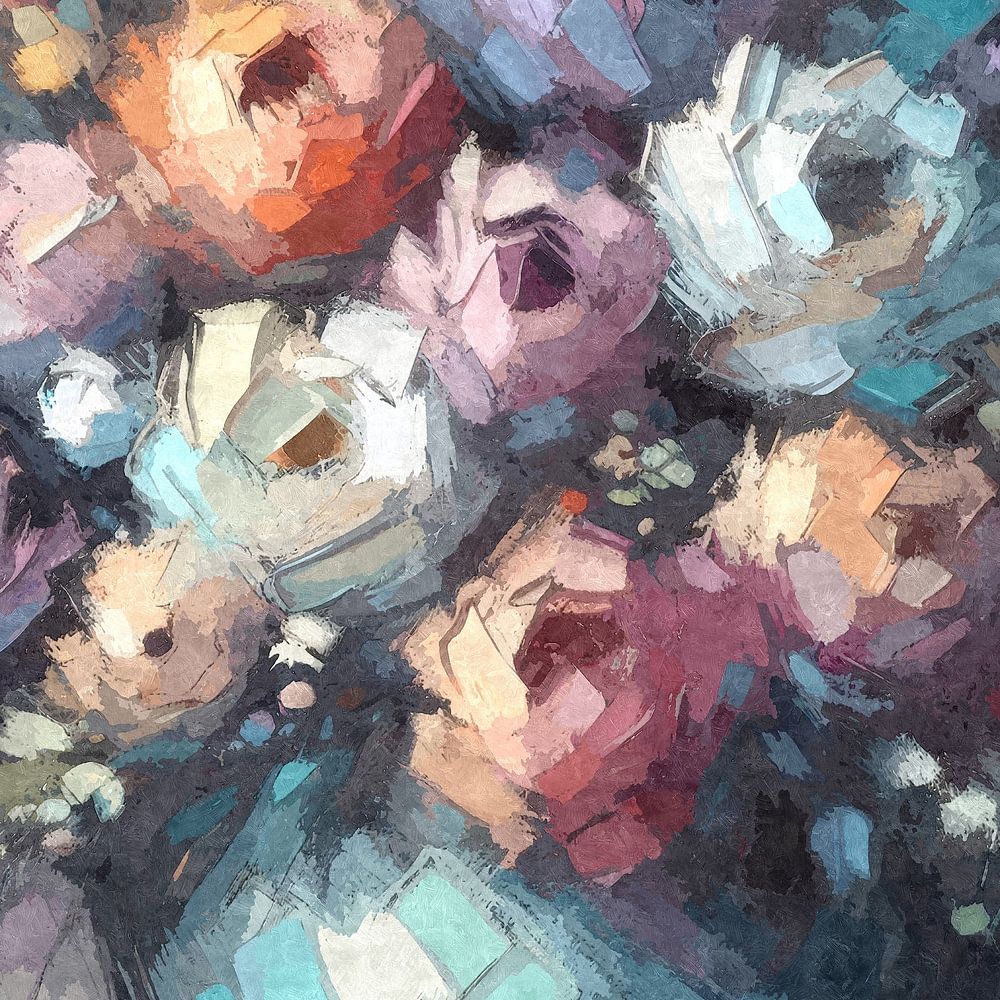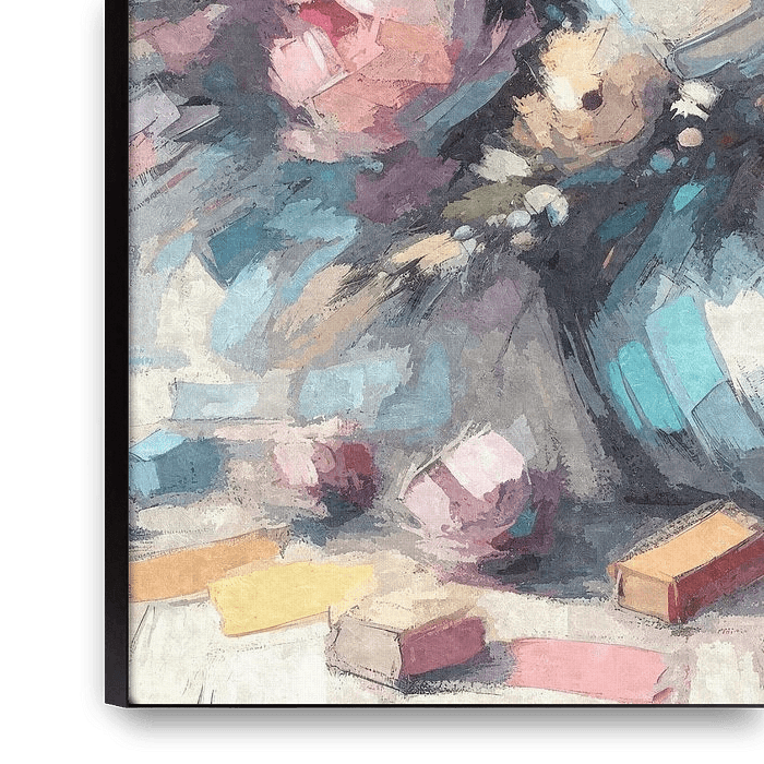 An expressive bouquet of flowers in bold and pastel shades unfolds its energy in a turquoise-coloured vessel. The angular, dynamic brushstrokes lend the motif a modern, almost cubist touch, while the soft colours create a harmonious balance. Pastel chalks at the edge of the picture hint at the creative process and make the work…