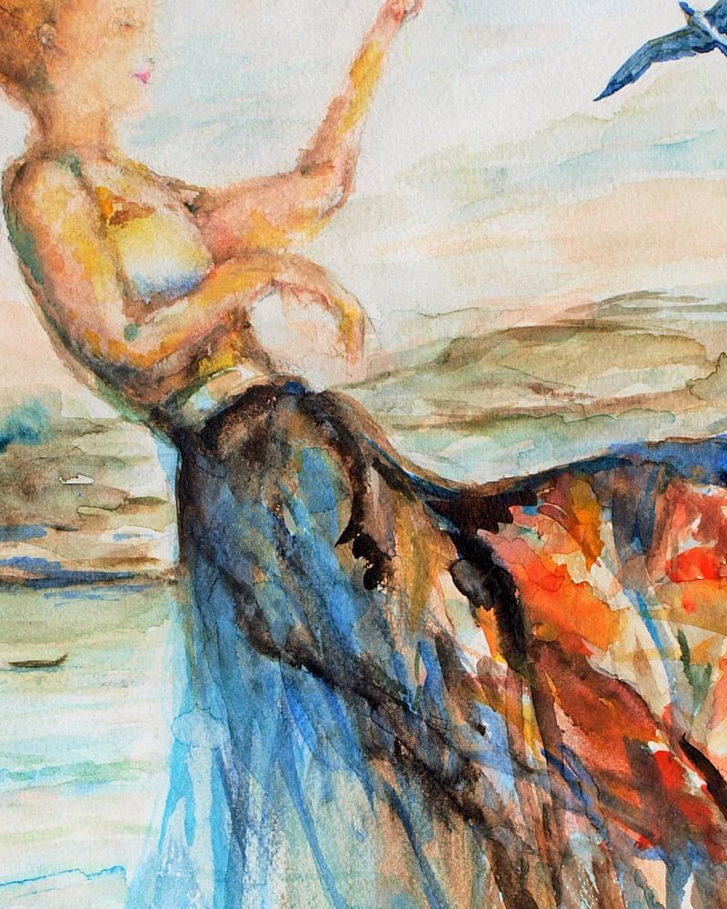 A watercolor inspired by a picture I saw in a magazine. The original has light blue , gray and beige colors , so I made this variation with more color because for me it is a summer picture . Dancing without worries in the summer light at the seaside . The sun gives pink red shadows on the water and makes the red hair of the woman shine. The seagulls dance with her.
