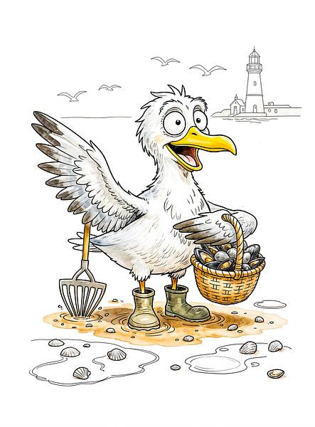 A playful coastal bird explores the tidal flats, gathering seashells with a bucket and shovel. This comic‑style scene captures the charm of seaside adventures, perfect for beach lovers, coastal décor and whimsical character art.