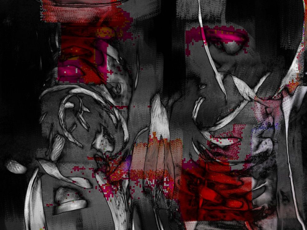 Abstract digital gouache painting of basketball shoes on gray concrete background with red accents