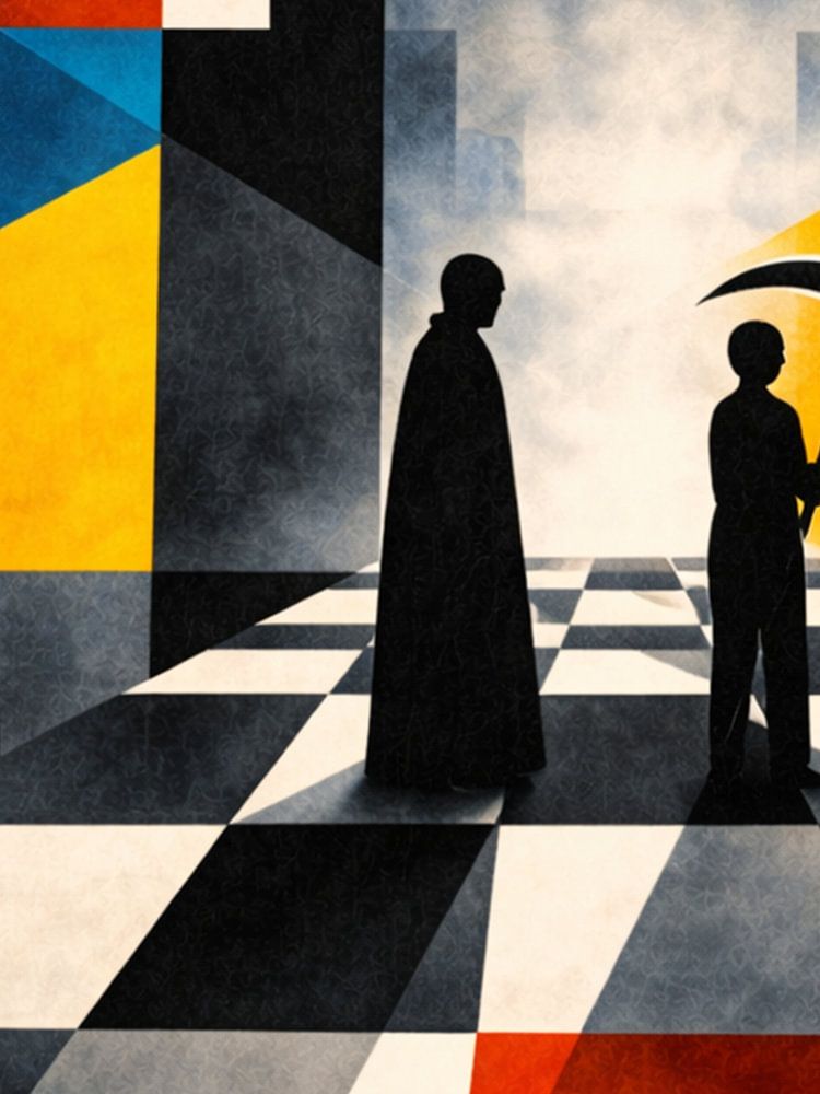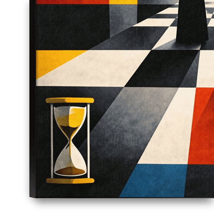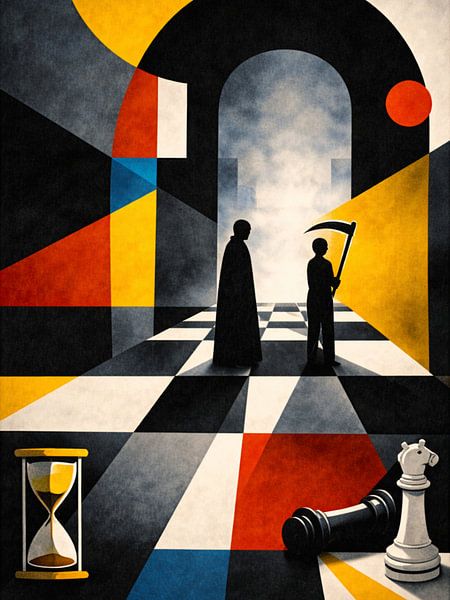 A modern Bauhaus abstraction reflecting humanity’s confrontation with time and inevitability.