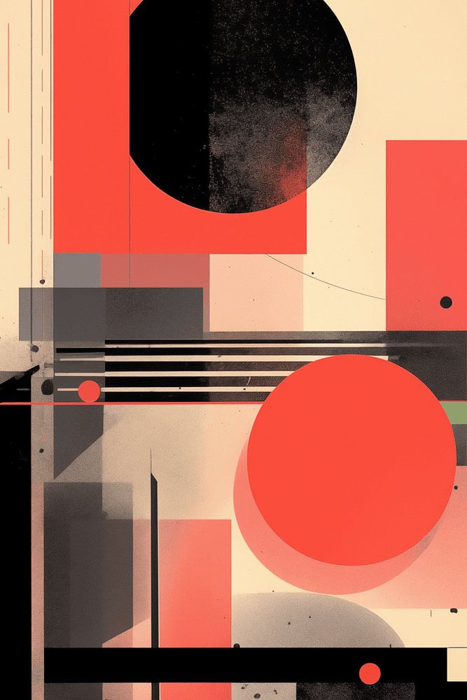 An abstract geometric artwork in which red, black and beige come together. Clean lines and circles create a dynamic play of rhythm and contrast, inspired by constructivist shapes and modern typography.