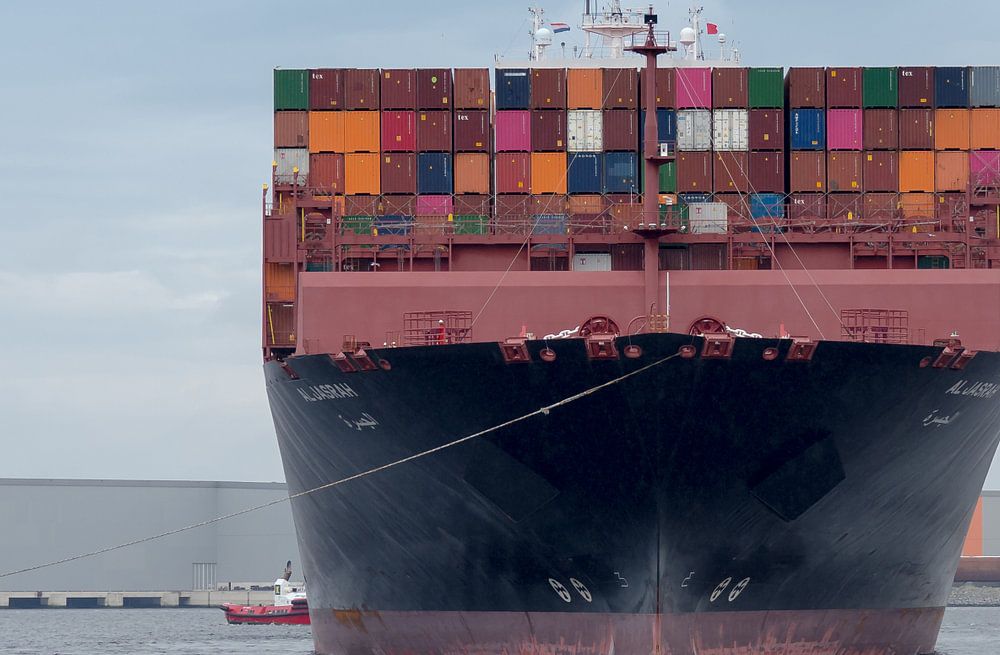 A container ship with a capacity of 14500 TEU is en route to the port of Rotterdam using a tugboat. With the tugboat next to it you can clearly see how big the container ship is.