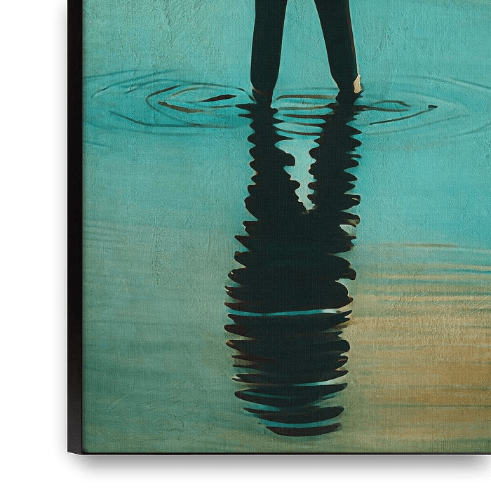 The painting captures a poignant moment as a man, dressed in a pristine black suit, stands with his back to the observer. He is waist-deep in a pool of water, seemingly oblivious to the incongruity of his formal attire immersed in the liquid. His gaze fixes on a vast, jet-black sea, an inky expanse that stretches to the horizon. Between…