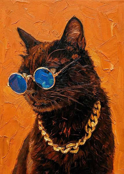 This artwork features a stylish black cat wearing round blue-tinted sunglasses and a chunky gold chain, giving it a confident and cool personality. The painting is done in a textured, expressive oil style with thick brushstrokes, set against a vivid orange background that makes the cat stand out dramatically. The combination of bold…