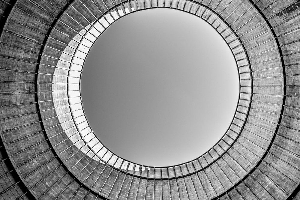 Urbex photography, cooling tower. Black and white treatment. Graphic and mysterious side. Considered one of the most beautiful urbex places in Europe.