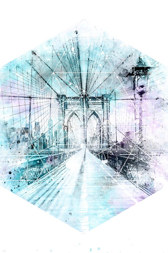 The Brooklyn Bridge in New York City connects the boroughs of Manhattan and Brooklyn by spanning the East River. Modern colour accents and graphic nuances find a revolutionary combination in this image. Jazzy watercolor underline the urban dynamic structure. Extravagant impression in a geometric shape with coordinates.