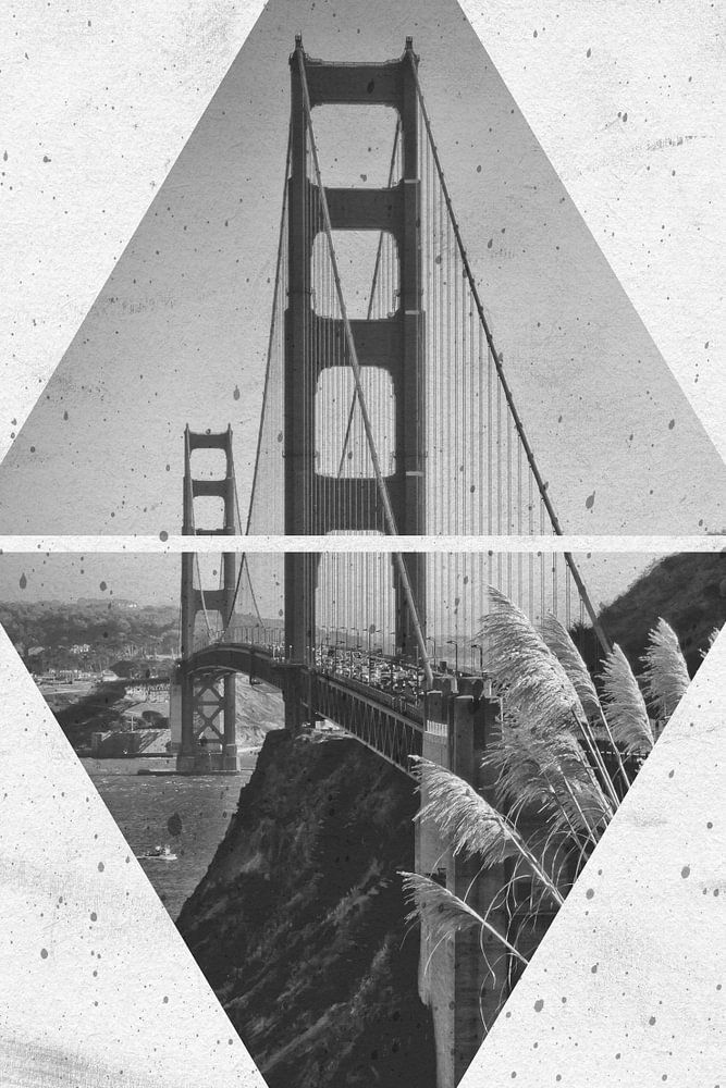 This is a classical architectural cityscape of Golden Gate Bridge in a geometric shape with coordinates. Decorative black and white vintage design from San Francisco.