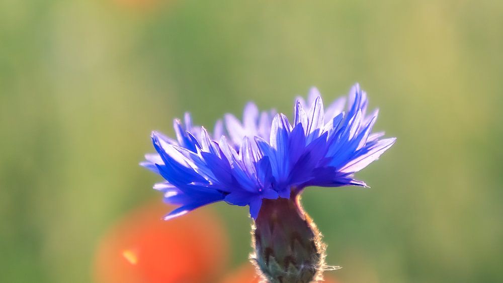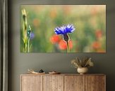 Buy this flower art Cornflower between poppies by Jacky Keeris on canvas, ArtFrame, poster and wallpaper, printed on demand in high quality.