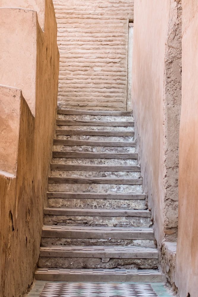 The El Badi Palace is a large palace, or the remains of one. With orange walls and colorful floors. Water tanks, citrus trees and wooden doors in the courtyard. And storks on the walls.