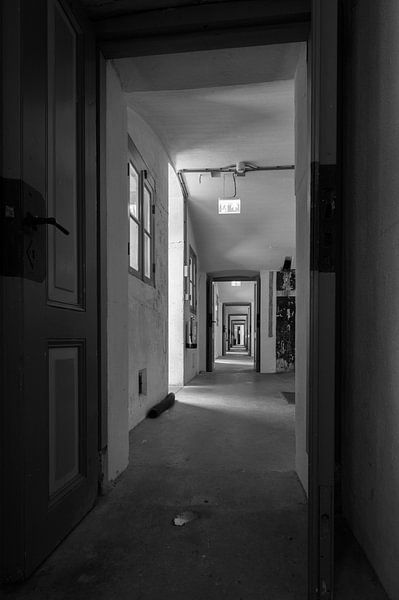 Fort Nigtevecht which is part of the Defence Line of Amsterdam, a 19th century fortification, has many corridors. This work shows one of those corridors. The long corridor provides a beautiful depth in this work and the light through the small windows and door casts beautiful shadows through the corridor.