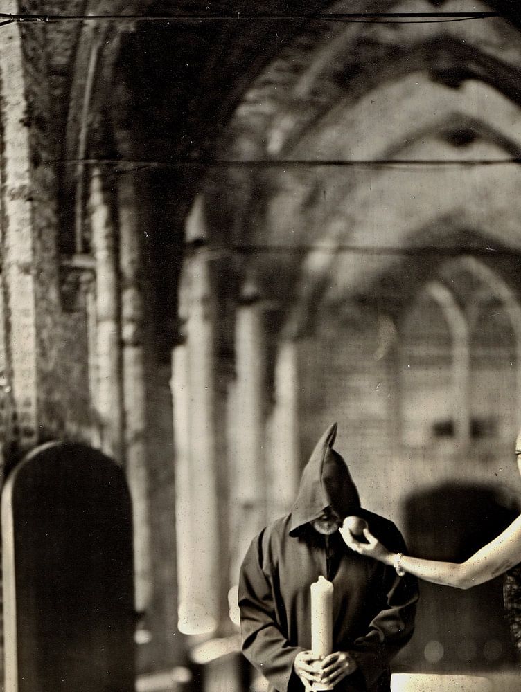 Seduction, monk is seduced in monastery ( Graefenthal )wet plate collodion photographs . This is an old photo technique where pictures are taken on a glass plate covered with silver.