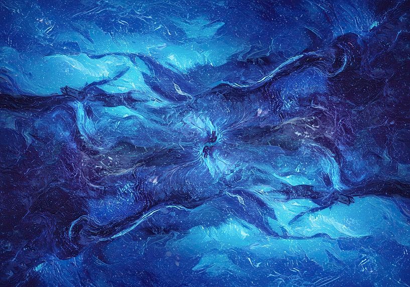 An abstract, high-resolution digital artwork featuring a swirling vortex of deep blues, purples, and electric aquas. The texture suggests a liquid or gaseous form, reminiscent of a nebula or a deep-sea current, with hints of stardust and light scattered throughout the chaotic, yet balanced composition.