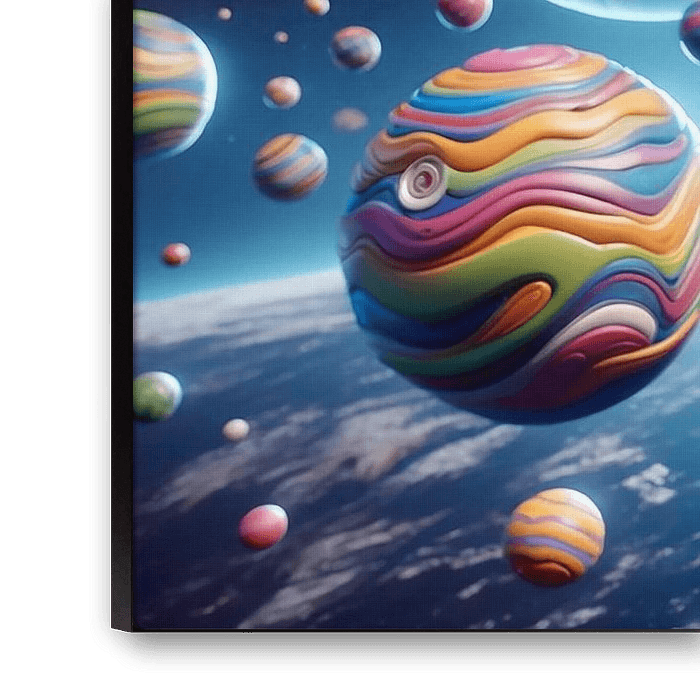 This playful picture transports us to an imaginative space scene in which a chubby penguin hovers at the centre of the action. Equipped with an astronaut suit, the cheerful character explores a universe that is as colourful and lively as his dreams. The infinite cosmos stretches out behind him, populated by a variety of colourful, striped and speckled planets that differ in size and shape. Smaller satellites and stars float all around, dancing in this weightlessness. The background is filled with the blue globe and a sea of stars, representing the boundlessness and beauty of space. The depiction is an ode to the imagination and the childlike joy of discovery. The mixture of realistic depiction and imaginative composition invites us to indulge in the wonders of the universe and reminds us that anything is possible in the realm of imagination.