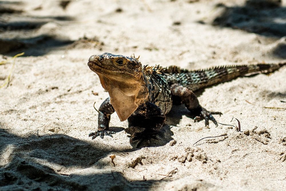 The picture shows an iguana standing firmly on the sand, its muscular legs slightly flexed, ready to move. Its skin, covered with coarse scales in shades of green and brown, reflects the light, emphasising its robust and rugged appearance. The iguana keeps its long tail low, resting on the sand behind it. Its head is raised high, with sharp eyes alert and watching its surroundings. The row of spines along his back gives him an impressive, almost prehistoric appearance. The sand under his claws is slightly disturbed, with small pits where his paws were, while the rest of the environment remains serene and pristine.